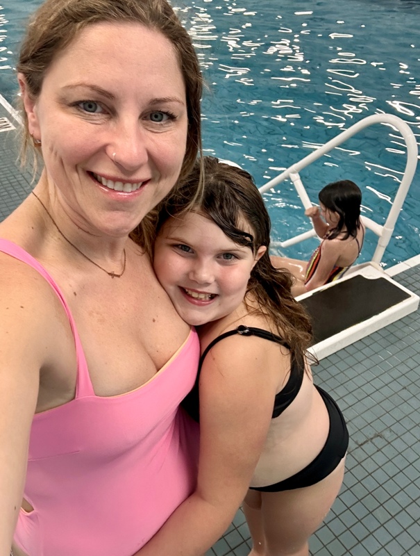 returned and she and my friend and I went swimming in the apartment block pool before we went home."