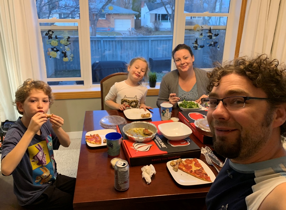 "Just me and my family enjoying a pizza supper that Grandpa Wayne bought for us on November 4th."